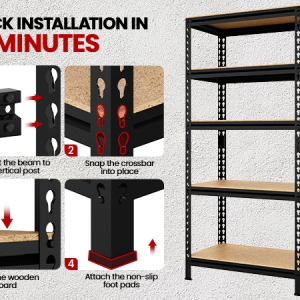Quick Overview: Keep your garage, pantry, kitchen, or workspace tidy with this versatile utility shelf. Its five fully adjustable shelves and configurable boltless design let you store items of all shapes and sizes, from tall storage bins to tools or groceries. Made from certified MDF and strong metal with a scratch- and water-resistant surface, it stays strong and reliable. Rubber footpads protect your floors and keep the shelf stable, making it easy for homeowners, renters, or hobbyists to create a neat, clutter-free space.