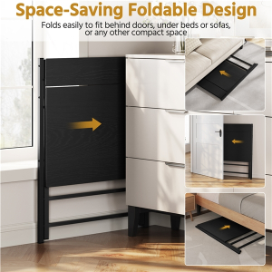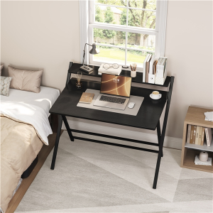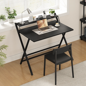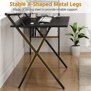 This foldable computer desk combines functionality, style, and space efficiency to suit modern home needs. Crafted from durable particle board and a reinforced X-shaped metal frame, it is stable and sturdy. The waterproof surface is easy to clean, while the elevated monitor shelf provides ergonomic viewing and extra space for essentials. Whether placed by the window, sofa, or bedside, its compact design and generous legroom make it versatile and comfortable for daily use. When not needed, it folds flat for quick storage under a bed or behind a door, making it ideal for small apartments, dorms, or flexible workspaces. Whether you\'re studying, working, or browsing, this desk brings convenience and contemporary charm to any room.