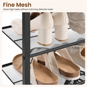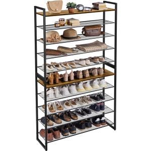This vertical shoe organizer is built with a sturdy 10-tier iron frame, elegantly topped with rustic wood and breathable mesh shelves. The modular structure adapts to your layout, stacking high or splitting into two units to neatly house your entire collection.