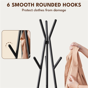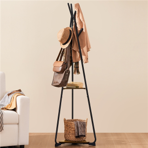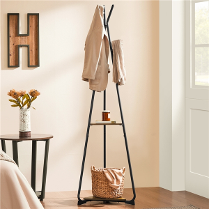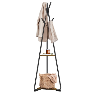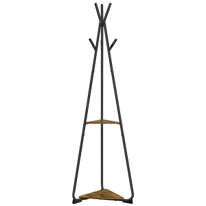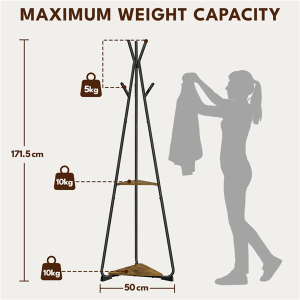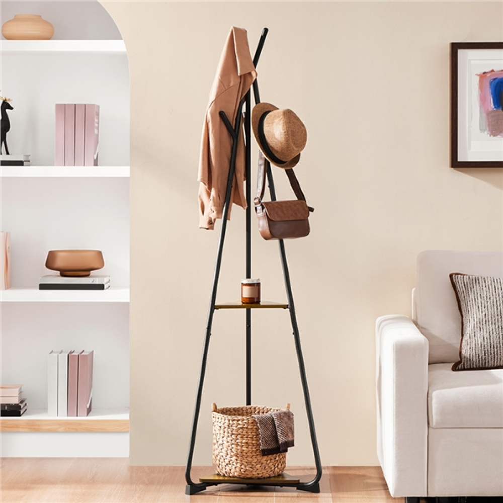 Start your day with calm and order. This industrial freestanding coat rack combines sleek design with everyday function. Crafted with durable bake-coated metal and sturdy particleboard shelves, it supports up to 10 kg on each shelf and 5 kg on each hook. The triangular-shaped frame tapers from a wide base to a slim top, ensuring stability and style in one. Great for bedrooms, living rooms, or balconies, it keeps coats, towels, and accessories neatly arranged. Compact yet spacious, it fits small homes beautifully—making mornings smoother and your space effortlessly tidy