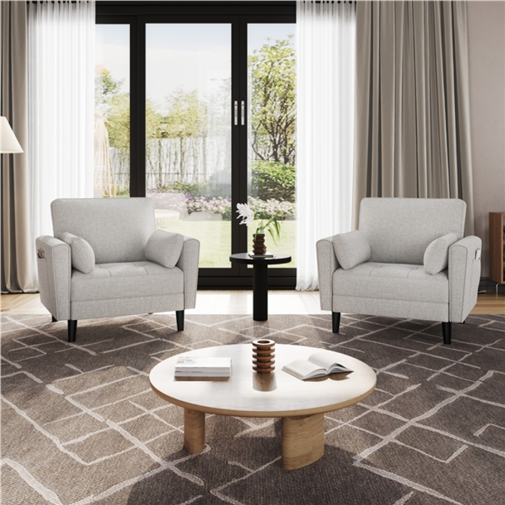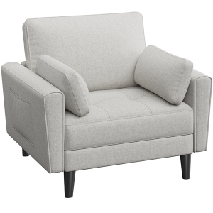 Check out this modern tufted sofa chair! This armchair is built with a sturdy wooden frame and four strong legs, ensuring durability. The roomy padded seat and loose back cushion offer maximum comfort without feeling cramped. Plus, it features two matching accent pillows to add a touch of style. This large occasional chair comfortably seats one person regardless of size or one person with pets, making it great for hosting guests or simply unwinding at home. It even has storage pockets on each armrest to keep your essentials close by. The neutral upholstery and sleek design create a relaxed and welcoming vibe that will complement any space, big or small. So, kick back, relax, and enjoy the comfort and style this wide armchair has to offer!