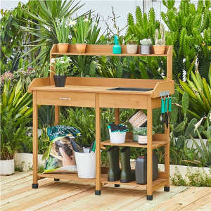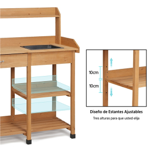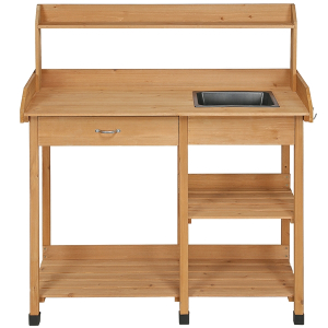 Quick Overview: This 100% fir wood gardening console with an unadorned wood look can harmonize with your garden or backyard. The thoughtful functions make it a dedicated gardening assistant. The spacious table top with a removable sink provides a special place for transplanting, watering, washing, transplanting, or mixing nutrient soil and facilitates the afterward cleaning. The elevated rack, smooth drawer, open shelf, and 3 side hooks can meet your needs. This storage garden table is a professional gardening and storage solution.