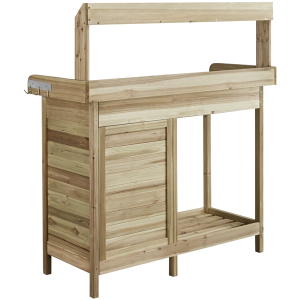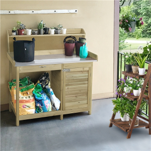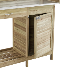 Keep your garden flowing smoothly with this fir wood potting bench, featuring a metal tabletop that\'s easy to clean and sturdy enough for heavy tasks. Side hooks, a drawer, cabinets, and an elevated rack keep tools, pots, and supplies organized, letting you focus on planting. Its waist-height design provides a comfortable workspace, while the freestanding structure allows flexible placement anywhere in your garden.