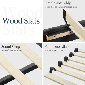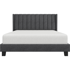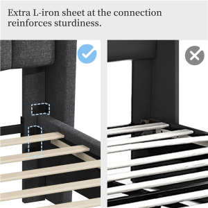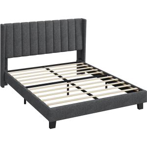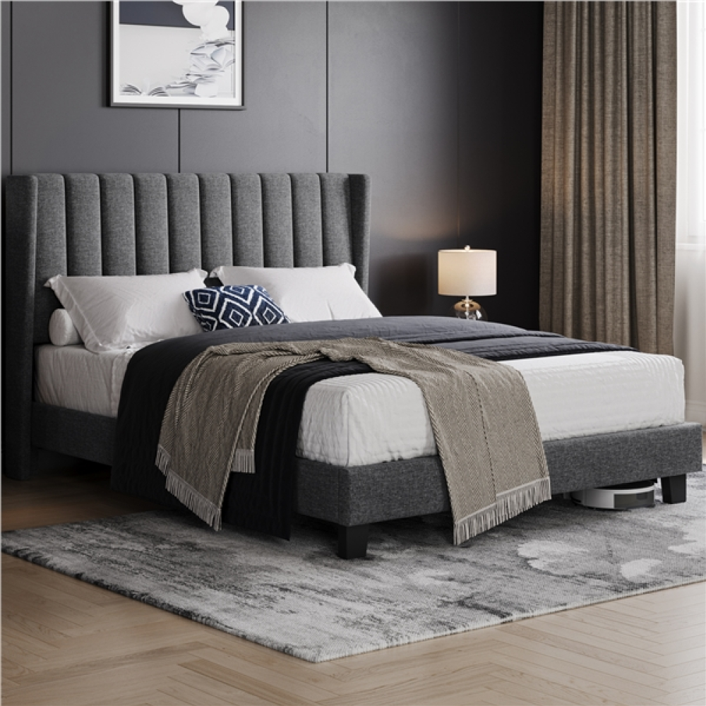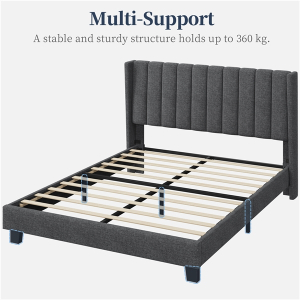 Specifications: Colour: Dark Grey Slat Quantity: 10 Materials: Engineered Wood, Linen-Blend Fabric, Foam, Metal Assembled Dimensions: 207.5 cm L × 157 cm W × 104 cm H Applicable Mattress: 5ft King, 150 cm W × 200 cm L Distance between Headboard and Bedstead: 22 cm Bedstead Height: 23.5 cm Under-bed Space: 11 cm Slat Spacing: 12.5-13.5 cm