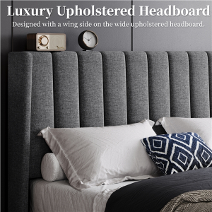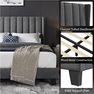 Quick Overview: Whether you\'re dressing up the main suite or need a statement piece for your loft, the upholstered platform bed is your ideal addition, offering a comfortable sense of security and creating a boutique experience for the modern family. This upholstered platform bed combines a sturdy metal frame, foam padding, linen-blend fabric, and engineered wood for lasting durability. The upholstered headboard, wooden slats, and central support legs provide reliable mattress support, creating a comfortable and secure environment. With modern, clean lines and classic tufting, this exquisite piece of furniture brings elegance and sophistication to your bedroom.
