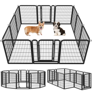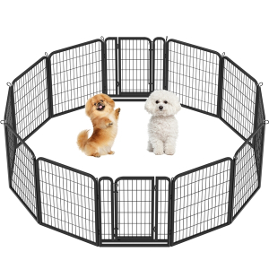 Our pet playpen is made of premium steel with a black finish, which ensures a long life span. This pet fence creates an enclosed area with an open top for pets to play and exercise. You can use this pet playpen to limit your pet’s exercise area or to separate him/her from different pets. This durable pet playpen is suitable for dogs, ducks, rabbits, etc. It is easy to set up with no tools required. It can be used indoors or RV camping, traveling, or for other yard activities. Panels are connected by metal stakes, which allow this dog playpen to be flexibly built in various shapes by adding or removing panels.