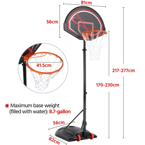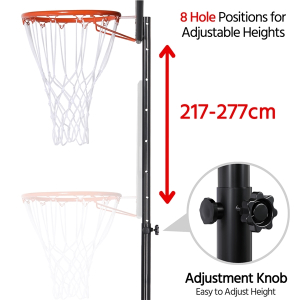 Turn your backyard into a playground filled with laughter and memories with our Portable Basketball System. It has a big weighted base that can be filled with water or sand for added stability and safety, and the two wheels ensure good mobility of the stand. Featuring 6 pairs of holes for height adjustments, the telescoping post can be easily adjusted from 217cm to 277cm in 12cm increments.