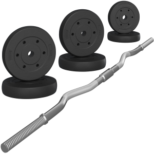 Customize your workouts with this versatile barbell weight set. It includes a curl bar that reaches 120 cm when assembled with the 10 cm connecting rod, two 2.5 kg plates, and four 5 kg plates, designed to enhance your leg, hip, and back strength. Made from durable nickel-plated iron, concrete, and HDPE, this set is robust for long-term use. The ergonomic W-shaped curl bar features an anti-slip, knurled grip to ensure a secure hold, while star locks keep the weights firmly in place. Easy to store and transport, this weight-lifting bar set is a practical addition to homes, garages, and gyms.