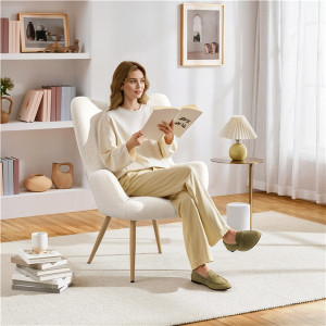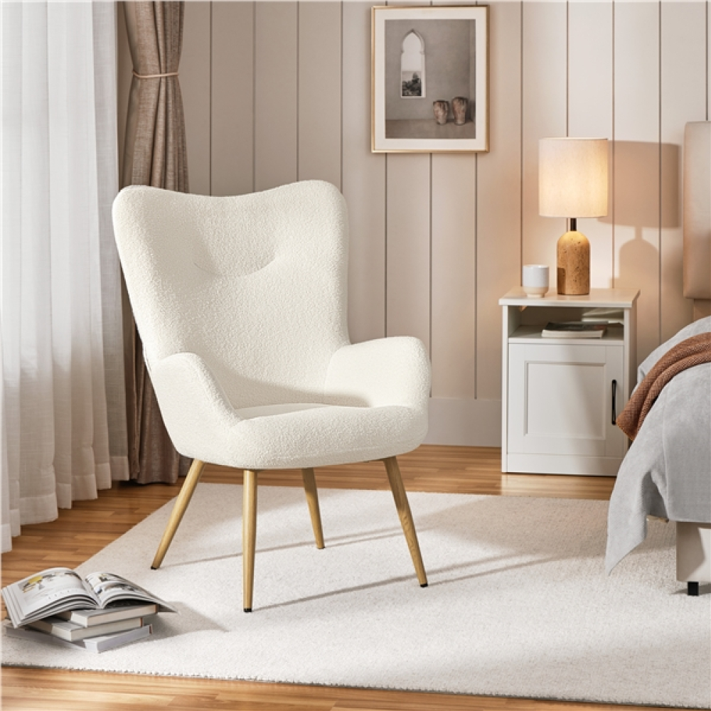 Add an individual touch and snuggly comfort to your living room with our boucle accent chair. This accent armchair is crafted of premium polyester boucle fabric, solid metal legs and resilient foam fill. The accent chair features a retro backrest, smiling mouth tufting, and wood-tone tapered legs, adding a contemporary touch to your space. A larger sitting area and a broad, high back create a comfortable setting for quiet reading or illuminating conversations. The accent chair is covered in boucle fabric upholstery, which adds texture and elegance to your home. A great addition to your living rooms, bedrooms, offices, guest rooms, apartments, and more.