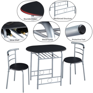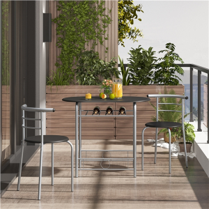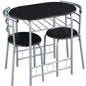 Create a cozy dining area with this practical dining table set. This set is made of premium MDF boards and a metal tube structure, sturdy enough for years of use. Daily maintenance will be easy with a waterproof tabletop and powder-coated steel legs. Given 2 chairs, you can enjoy coffee or breakfast alone, with your partner or friend comfortably. When the chairs are pushed in, this compact dining set takes up very little room, which is ideal for small spaces. This set showcases curved lines and round edges and gives you a relaxed and inviting feeling. The timeless color scheme and small dimensions make this set ideal for kitchens, balconies, bedrooms, apartments, dorm rooms, offices, cafés, temporary activities, etc.