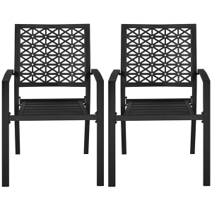 This 2pcs garden dining chair is a harmonious blend of elegance, comfort, and durability. Crafted with an eye for beauty and functionality, this chair embodies the rhythmic and rational beauty of music in its design. The repetitive geometric patterned backrest and classic black metal surface exude a sense of grace and reason.